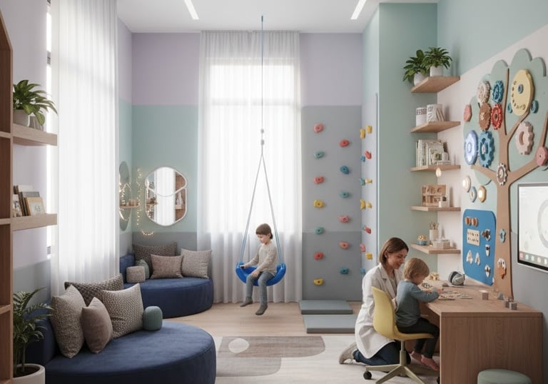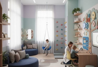 Designs lúdicos e funcionais para espaços de saúde e hotéis.